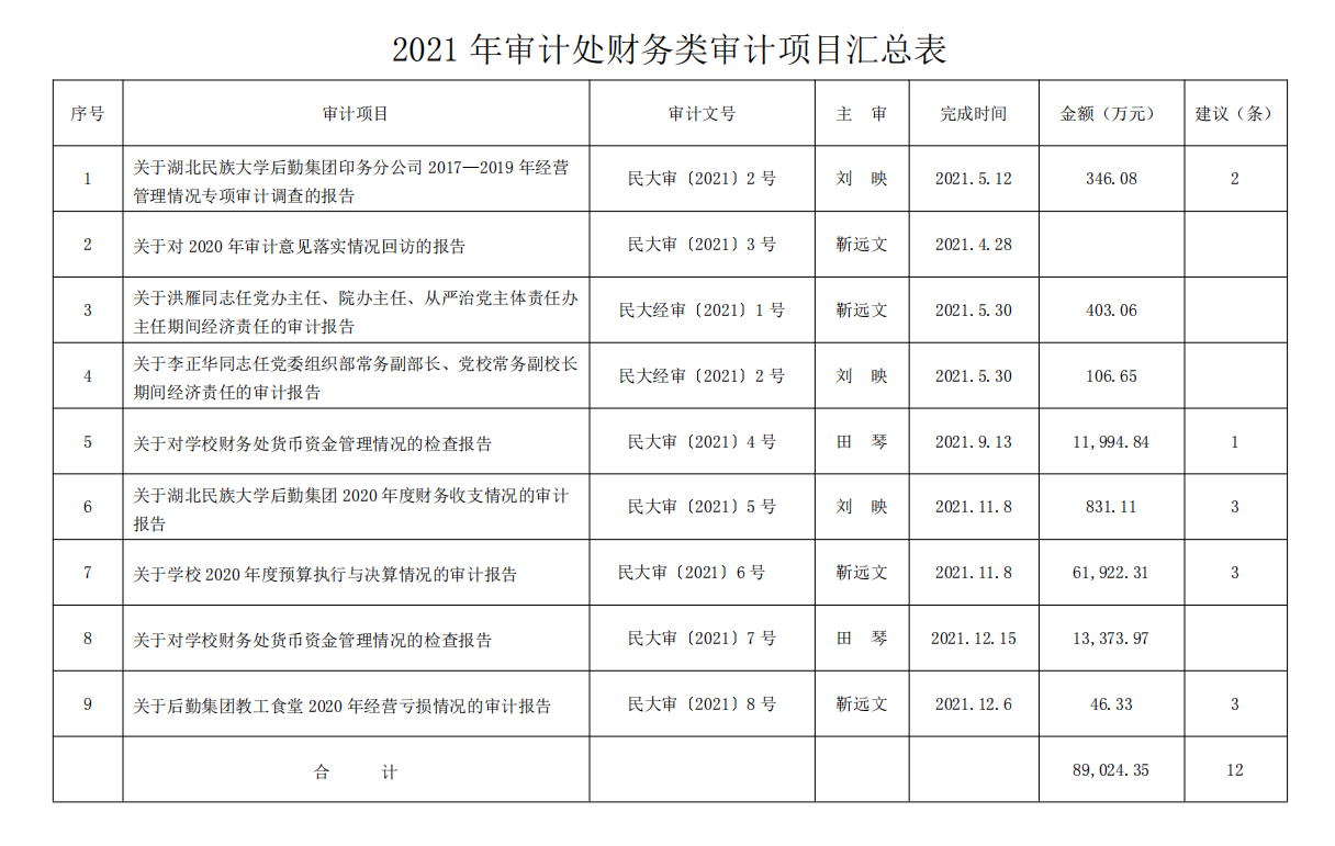 2021年审计处财务类审计项目汇总表