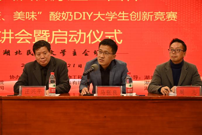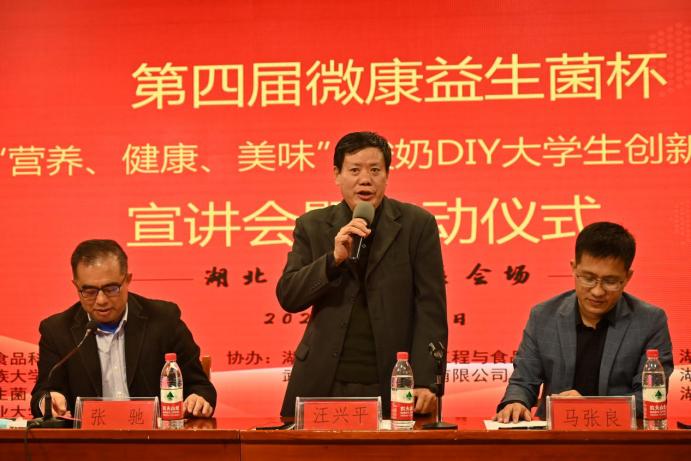 学校党委副书记、副校长汪兴平宣布本届微康益生菌杯酸奶DIY大学生创新竞赛正式启动。