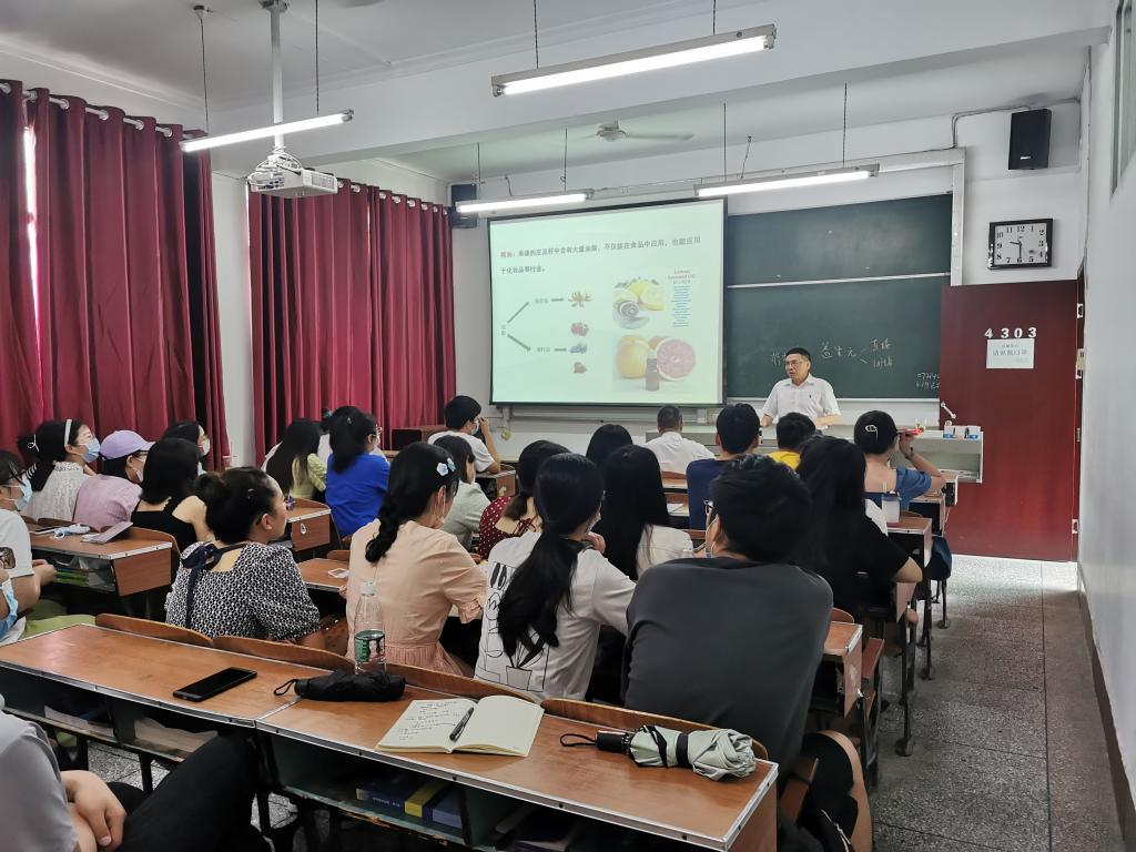 (本网讯 通讯员 程超 文/图)国务院学位委员会学科评议组成员、国家柑橘产业技术体系采后处理与加工岗位科学家、湖北省普通高等学校跨世纪学术骨干、湖北省新世纪高层次人才、湖北省人民政府第四届咨询委员会特邀专家、湖北省科技发展计划技术领域专家组成员、中国食品科学技术学会果蔬加工技术分会常务理事、中国农学会农产品贮藏加工分会常务理事、中国农业工程学会农产品贮藏加工分会常务理事、湖北省出口农产品安全卫生监控中心技术委员会委员、食品科学、食品工业科技、农产品加工学刊、农业工程技术等杂志编委潘思轶教授,在生科院4303教室做关于“大健康背景下果蔬加工产业的发展趋势”以及“立足资源特色,提升研究水平”的专题讲座。我院食品科学与工程专业部分教师及全体硕士研究生参加此次了讲座,周志书记主持。