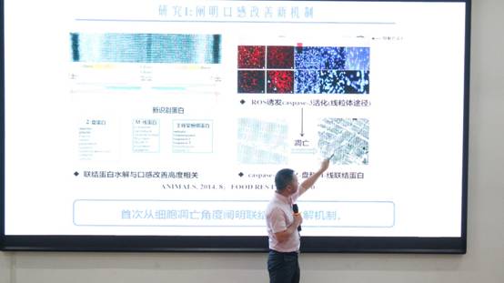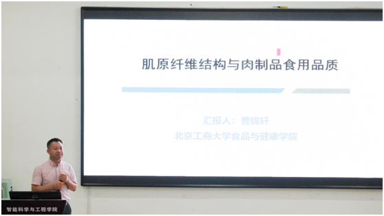讲座伊始,生工院党总支书记周志对曹锦轩教授进行详细介绍。曹教授团队在国际知名期刊发表高质量SCI论文100余篇,其中JCR一区80余篇,学术贡献与国际影响力不断提升。曹教授团队授权发明专利50件,为高品质肉制品生产技术提供有力支撑。曹教授详细介绍其研究团队在肌原纤维结构对肉制品食用品质影响方面的三大成果:一是揭示口感改善新机制;二是揭示滋味形成途径(肌球蛋白水解);三是探究气味稳定原理及肉制品增香应用。曹教授还通过分享自己的成长经历,激情鼓舞学子们:积极投身科研,勇于攀登科技高峰,以探索精神推动科技进步,共创辉煌未来!