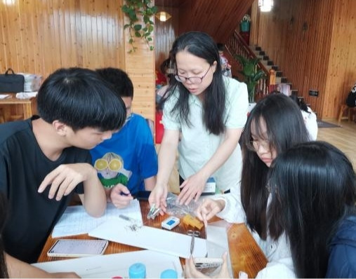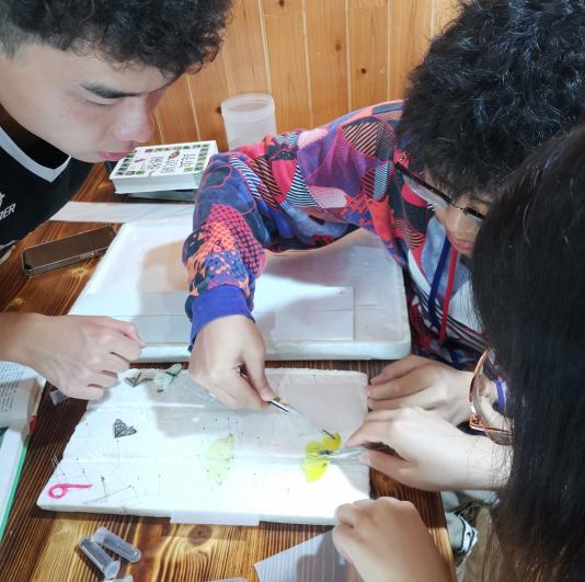 动物学团队采用先采集,再检索的形式,带领学生认识、抓捕蝴蝶、蜻蜓、蜜蜂、甲壳虫、竹节虫、蝗虫、天牛等动物。回驻地后李玲老师对不同动物标本如何处理进行了分组讲解,学生小组合作对采集的标本依据不同种类不同处理方式,进行了展翅处理和整肢处理。