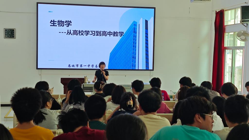 本网讯 5月29日下午,生物科学专业举办中学名师进校园活动,邀请恩施市第一中学生物备课组长易美兰老师为我院师范生带来中学生物前沿教学理念与实践经验分享。此次讲座旨在助力师范生深入了解高中生物教学趋势,提升专业素养与教学技能,为未来教育事业储备力量。