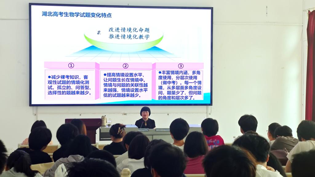 讲座围绕湖北省新高考改革下的生物教学展开。易老师开篇解读了“四新”,即新高考方案、新课程标准、新课程体系和新教材,并结合2021-2023年湖北省高考试卷结构,让同学们清晰了解了新高考的基本情况。