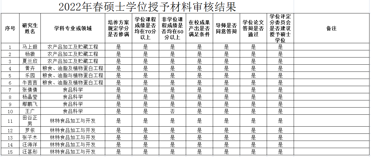 经研究生本人申请,导师同意,培养单位资格审查,学位评定分委员会审议,学科建设与学位管理办公室形式复核,学位论文学术不端行为终检等程序,共有马上超等15人完成硕士学位材料提交工作。现对材料审核结果进行公示,具体见附件。