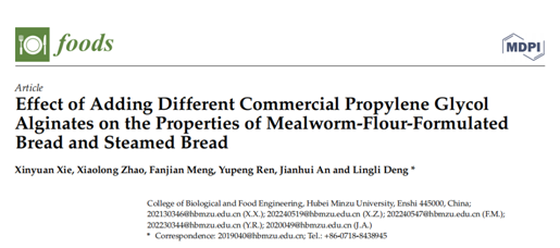 本网讯(通讯员 王智勇 王智勇/文 邓伶俐/图)近日,生物与食品工程学院汪兴平教授食品科学团队邓伶俐博士以3044am永利集团3044noc作为第一单位在《Foods》上发表论文“Effect of Adding Different Commercial Propylene Glycol Alginates on the Properties of Mealworm-Flour-Formulated Bread and Steamed Bread”。该期刊可在Scopus、SCIE(Web of Science)、PubMed等数据库中索引,其为JCR-Q1(Food Science & Technology)/CiteScore-Q1(Health Professions)期刊。5年影响因子为5.5。该研究得到了国家自然科学基金(批准号:32160610)的资助。