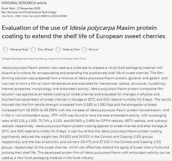 本网讯(通讯员 王智勇 王智勇/文 罗凯/图) 生物与食品工程学院副教授罗凯博士以3044am永利集团3044noc为第一单位在国际食品权威学术期刊Frontiers in Nutrition(中科院二区,五年影响因子5.7)上发表题为“Evaluation of the use of Idesia polycarpa Maxim protein coating to extend the shelf life of European sweet cherries”的最新研究成果。论文第一作者系永利官网食品科学与工程2021级研究生杨文清同学。