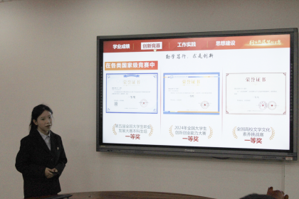 答辩会伊始,曾思琪对答辩会具体细节和评分标准进行简要介绍。为确保评选的公平、公正、公开,本次国奖答辩会分为学生个人自我展示、评委老师提问两个环节。答辩会现场,六位候选人分别从思想动态、学业表现、获奖荣誉、科研成果、社会实践、任职情况等方面进行约5分钟PPT演讲,阐述自己申报国奖的优势及核心竞争力。
