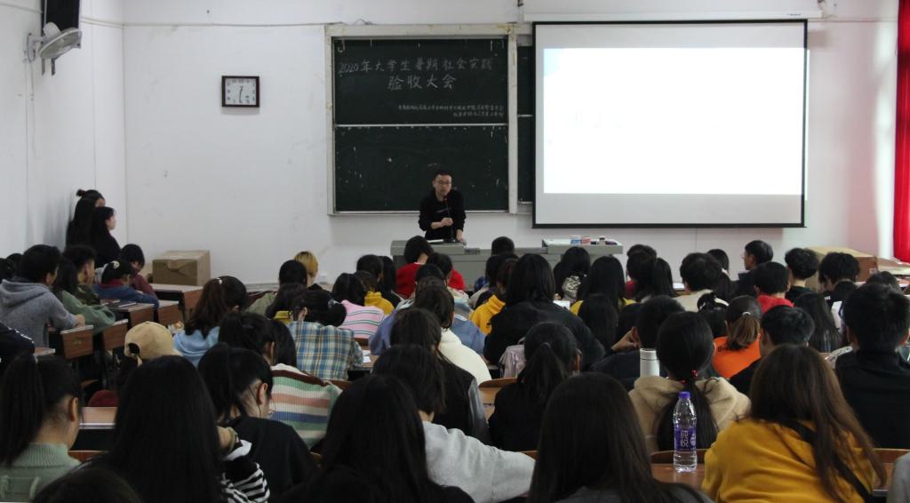 本网讯(通讯员 何燕 见习通讯员 唐欣新/文 通讯员 黄淑婷 见习通讯员 宋逍林/图) 10月16日中午,我院在4202教室举办2020年大学生暑期社会实践验收大会。我院团总支书记陈杰出席并担任本次验收大会的评委。团总支社工部副部长龙芳担任会议主持人,近120名学生参加本次大会。