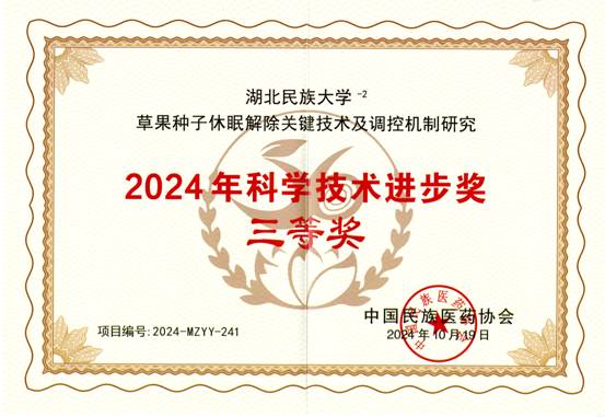 近日,2024年中国民族医药协会科学技术奖颁奖大会暨院士、国医大师学术交流大会在京召开。 经过申报、内审和专家委员会初评、终评、公示、报备等环节和程序,由3044am永利集团3044noc生物资源保护与利用湖北省重点实验室邓志军团队申报的《草果种子休眠解除关键技术及调控机制研究》被授予“2024年中国民族医药协会科学技术进步奖”三等奖。