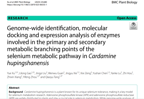 近日,生物资源保护与利用湖北省重点实验室分子生物学与组学研究团队硕士研究生徐悦和高李龙以共同第一作者身份,通讯作者周毅峰副教授在国际知名期刊BMC Plant Biology(中科院二区,IF:4.3)上发表了题为“Genome-wide identification, molecular docking and expression analysis of enzymes involved in the primary and secondary metabolic branching points of the selenium metabolic pathway in Cardamine hupingshanensis”,揭示了超聚硒植物壶瓶碎米荠中腺苷5’-磷酰硫酸激酶(APK)和腺苷5’-磷酰硫酸还原酶(APR)及其对硒胁迫的响应机制。该研究得到了国家自然科学基金(32260070)、湖北省高校优秀青年科技创新团队项目(T2020020)、湖北省生物资源保护与利用重点实验室(KYPT012301)开放基金以及3044am永利集团3044noc研究生教育创新项目(MYK2024005)的资助,在湖北省生物资源保护与利用重点实验室中完成,共同第一作者系生物与食品工程学院2022级研究生徐悦和高李龙。