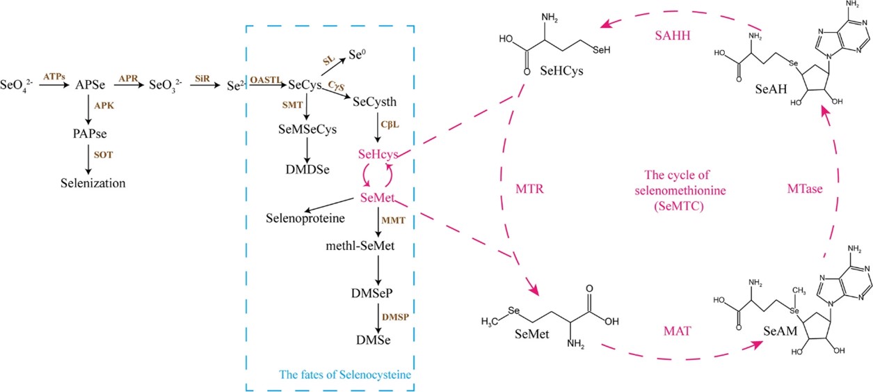 植物中硒代谢和硒代蛋氨酸循环示意图。ATP:ATP硫酸化酶;APSe:5'-磷酸硒酸腺苷;APK:5'-磷酸腺苷激酶;PAPSe:磷酸腺苷磷硒酸盐;SOT:磺基转移酶;APR:腺苷5'-磷酸硫酸还原酶;SiR:亚硫酸还原酶;OASTL:O-乙酰丝氨酸(硫醇)裂合酶;SeCys:硒代半胱氨酸;SMT:硒代半胱氨酸甲基转移酶;SeMSeCys:硒甲基硒代半胱氨酸;DMDSe:二甲基二硒化物;SL:硒半胱氨酸酶;CγS:胱硫醚γ合酶;SeCysth:硒代胱硫醚;CβL:胱硫醚β裂解酶;SeHcys:硒同型半胱氨酸;MMT:蛋氨酸甲基转移酶;methl-SeMet:甲基硒代蛋氨酸硒;DMSeP:丙酸二甲基硒;DMSP:二甲基磺基丙酸裂解酶;DMSe:二甲基硒化物