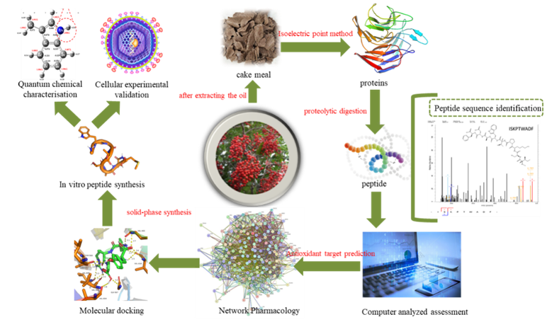 该研究首次从山桐子饼粕中分离并纯化了多肽,旨在发现具有出色抗氧化特性的多肽。研究人员采用超滤和葡聚糖凝胶色谱层析技术,从饼粕中成功分离并纯化了多肽。通过质谱分析,鉴定出具有显著抗氧化活性的馏分,并运用网络药理学和分子对接技术对多肽进行了筛选和表征。结果显示,CIPs-I-F2馏分展现出优异的抗氧化活性,共筛选出7种多肽,其主要作用靶点包括AKT1、STAT3和MMP9。其中,ISKPTWADF与靶点的总结合能最高。ISKPTWADF通过固相合成法在体外合成,并在HepG2人肝癌细胞中对H2O2诱导的氧化损伤模型显示出剂量依赖性保护作用,其主要活性位点位于52N-127H位的色氨酸吲哚环上。山桐子饼粕多肽具有较高的研究价值,为后续山桐子油料作物的利用和开发抗氧化肽功能产品奠定了基础。