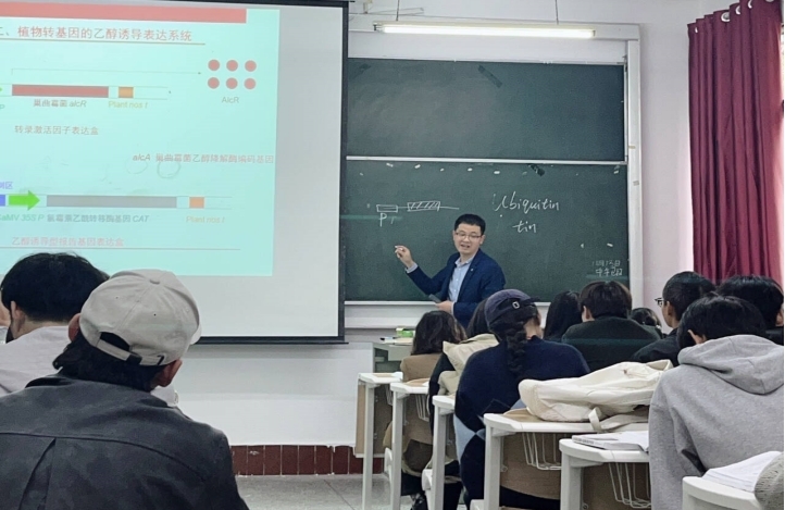 公开课上卢延克老师围绕高等植物的基因表达系统展开了《基因工程》课程的教学。卢延克老师通过生动的PPT,向同学们详细讲解相关知识。采用问答的形式,预留回顾时间,帮助同学们更好地理解课程内容,时刻关注学生的学习进程,展示了良好的师生互动。