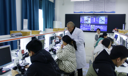 随后,操作实践环节,学生们跃跃欲试,眼睛紧盯目镜,双手小心调试焦距旋一钮。此时老师也在台下用春风化雨的方式指导成像不清的同学捕捉清晰画面。从一步步的显微操作成像到亲眼目睹洋葱根尖细胞的不同形态,惊喜又好奇,微观世界的神奇让大家沉醉其中、流连忘返。大家相互交流着自己的观察发现,现场气氛热烈非凡。