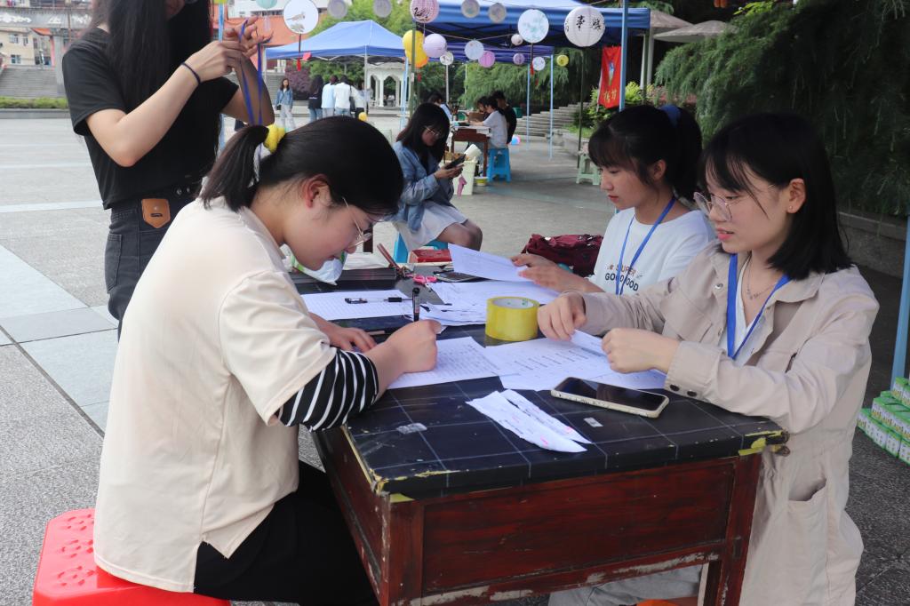 该活动以线上群内打卡和线下游戏环节两种形式开展。线上打卡环节要求学生在群内每天按时在规定时间内连续打卡21天,学生们的参与度很高,最终有86名同学完成任务。线下游戏区设定“成语接龙”,“踩气球大作战”,“真人棋子”,“心心寄语”四个游戏环节,只需要完成三个游戏就可以到指定区域领取两个小奖品,完成两个游戏也可以获得一个小奖品。正值今天5月20日,是个特殊的日子,在“”心心寄语”小游戏中,场上准备了贴纸片的展板,不少人落笔生花进行许愿祝福,期待心想事成,在纸上写下对亲人家人朋友爱人的表白话语,场上氛围高涨,欢愉一片。此外,场上还设置了书法创造区供学生创作体验,学生之间相互交流书法的魅力评价彼此的书法水平,一展自我风采。