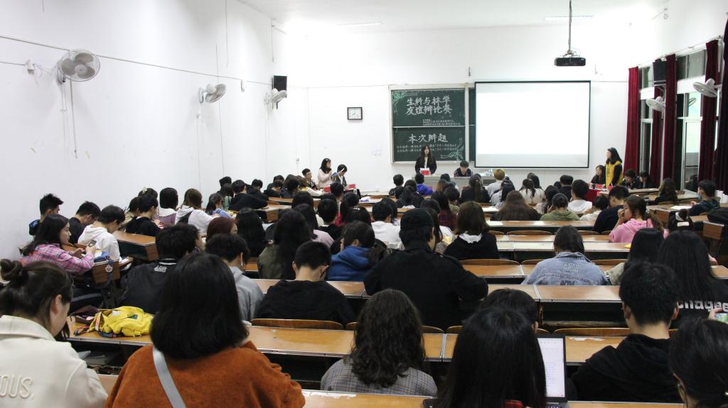 本网讯(见习通讯员 樊净/文 柯佳译/图)4月24日晚七点半,我院于4202教室举办生科与林学友谊辩论赛,特邀林学园艺学院优秀辩手粟伟杰、石一鸣和生物科学与技术学院优秀辩手李沛霖、吴淼出席并担任此次辩论赛评委。