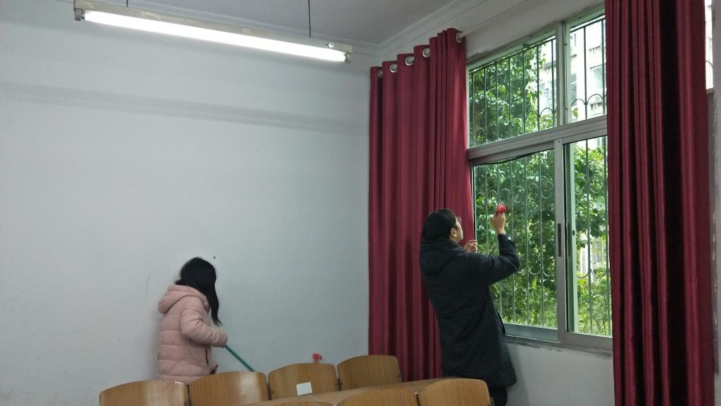 青马班干训成员于4202集合首先,团总支纪检部副部长付昕怡对本次活动背景,目的进行简单的介绍随后将人员分为七组,分别对生科院一二三四楼的教室走廊窗户楼梯,以及生科院早执勤站岗位置,各个展板进行打扫,再由消毒队进行消杀作业打扫完成后由付昕怡,肖晶对其进行验收。整个活动纪律严明,秩序良好,整体效果良好。活动结束后一位青马班干训成员在接受采访时到:“我认为在这个时期举办这样一次志愿服务活动是非常有意义的,让我们依然可以保持对疫情的敬畏之心。”