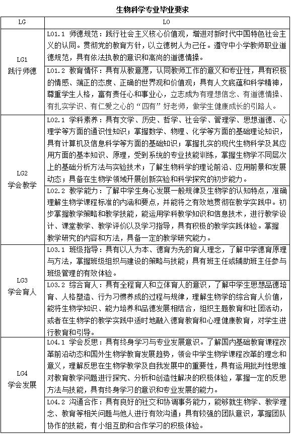 生物科学专业学生主要学习数理化基础、教育学及心理学基础理论和方法、生物学基本理论和基本知识以及人文社科知识,受到专业技能和教师教育技能的系统训练,本专业毕业的学生应具备生命观念、科学思维、科学探究、社会责任等生物学科的核心素养;具有前瞻性视野,较强的创新意识和自我发展的能力;践行师德规范和教师情怀,具备从事基础教育生物学及相关学科教育教学、教育管理和教学研究的能力及进一步深造的潜能。毕业生应达到的具体要求见下表: