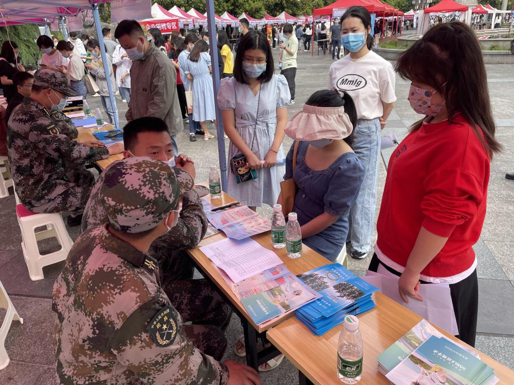 在招聘会征兵宣传现场,通过悬挂征兵宣传标语、制作宣传展板、发放征兵宣传手册等方式,就2022年应届毕业生参军报名条件、应征流程、优惠政策向大学生们作了详细的介绍和解答。现场登记应征意向学生30余人,现场报名17人。