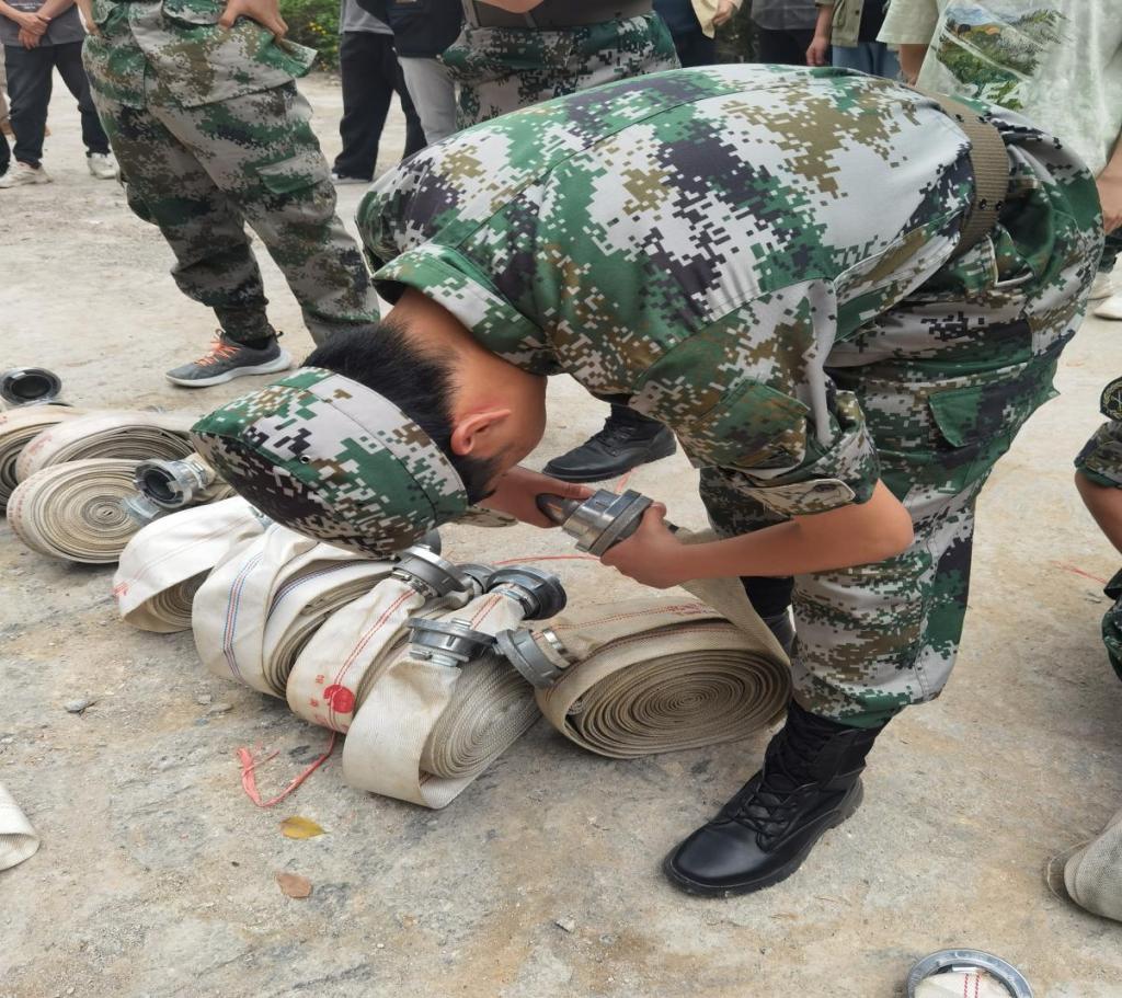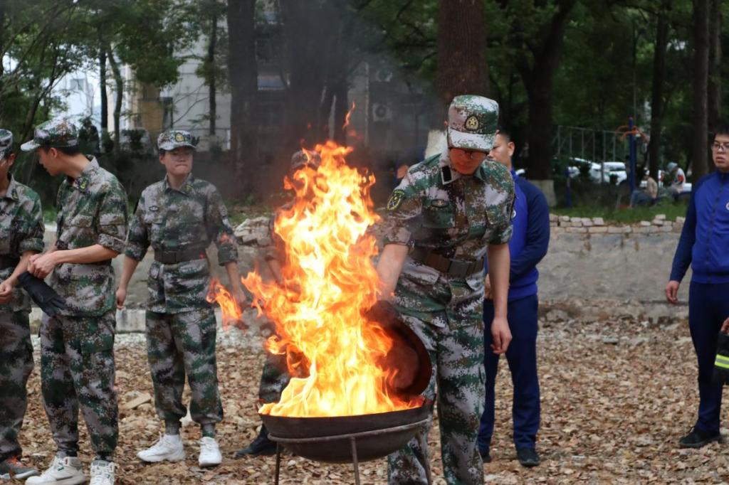 恩施市消防大队带领同学们进行常见消防设施设备的识别、干粉灭火器的使用、油锅灭火、消防水带连接等实操演练。