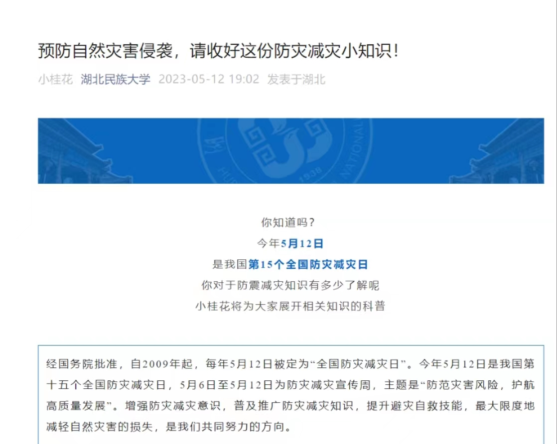 充分利用“三微一端”平台,在学校官方网站、微信公众号、校园广播台、行政楼前显示屏、学生宿舍楼栋显示屏等平台向全校师生广泛宣传防灾减灾安全知识;在校园内人员相对密集的6个场所张贴防灾减灾安全知识宣传喷绘;各二级学院在5月14日主题晚点名时,专题学习防灾减灾知识,并组织学生集中观看湖北省消防救援总队制作的防灾减灾宣传系列视频。
