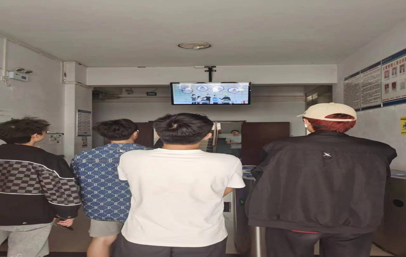 学生在寝室楼栋前屏幕上观看防灾减灾宣传片