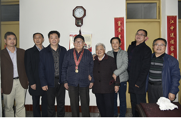 在赵友森老人家中,吴建清郑重地为赵友森老人佩戴纪念章,并与他亲切交谈,仔细询问老人的身体状况和家庭生活情况,倾听老人讲述当年抗美援朝的战斗故事,对老人在抗美援朝战争中敢于斗争、不怕牺牲的革命精神致以最崇高的敬意。回首烽火岁月,赵友森老人双手一遍又一遍地抚摸着金黄色的纪念章,激动得热泪盈眶。70年前,21岁的他在国家民族危难之际,挺身而出、保家卫国。如今已是鲐背之年,获得纪念勋章的激动与欣喜溢于言表。他说:“祖国越来越强大,大家的日子越过越幸福。学校也一步步发展壮大,希望学校越办越好。”
