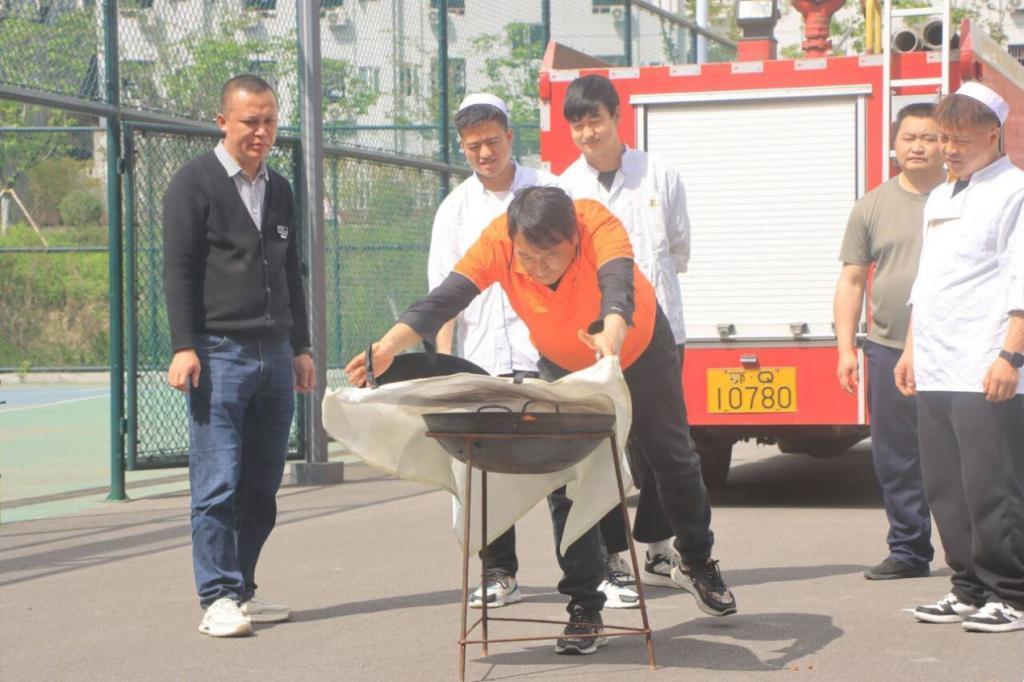 实操教学环节,保卫工作人员重点强调干粉灭火器“提、拔、握、压”的标准操作流程,着重强调初期火灾处置中“双具携带”的重要性,指导参训人员牢记上风口站位、对准火焰根部喷射的核心技巧;同时详细讲解消防水带抛接、连接技术,规范操作姿势,明确卡扣对接、弓步防护等动作要领;针对油锅火灾,现场演示了盖锅盖、灭火毯覆盖等处置手段及蔬菜覆盖、沿锅边泼水等辅助技巧。