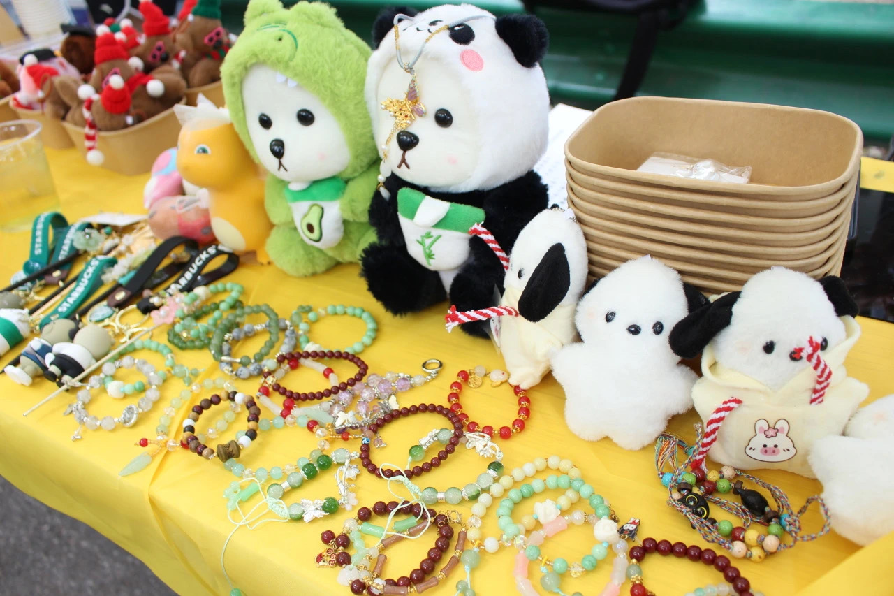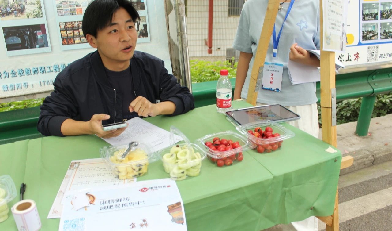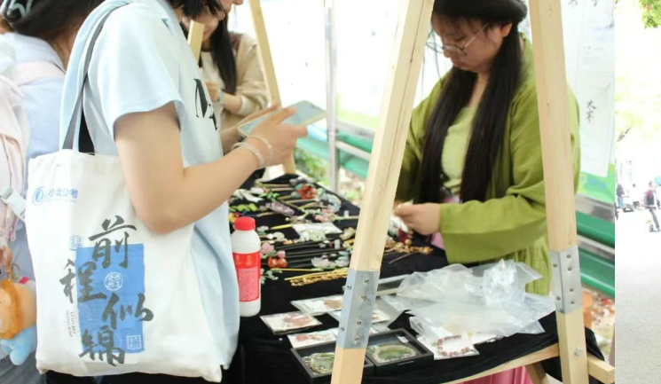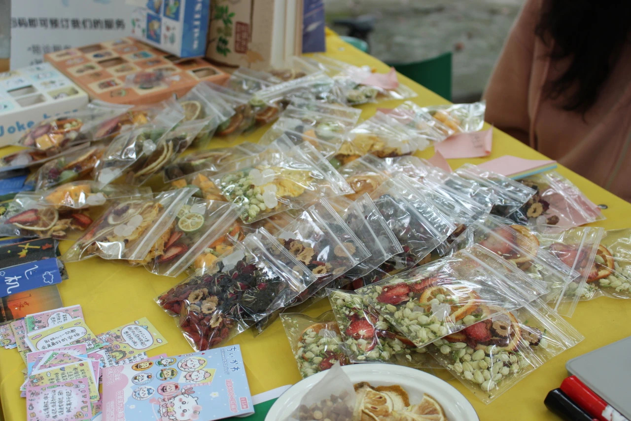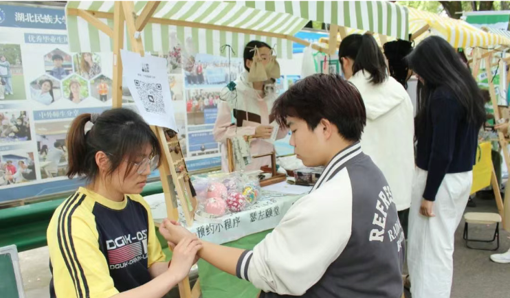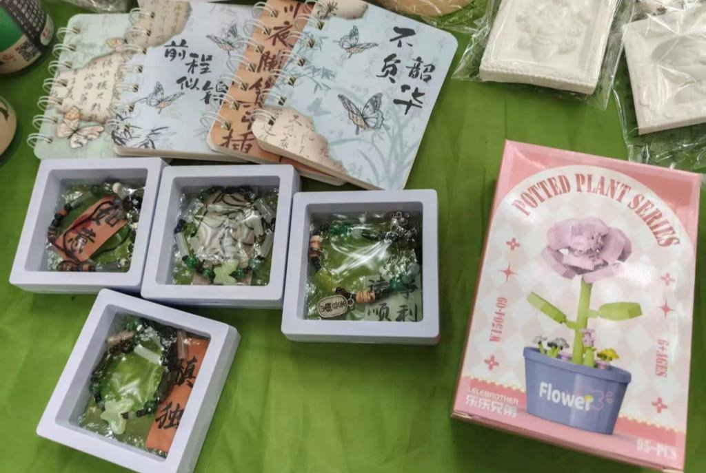 在中医展示区,阵阵药香扑鼻而来。特色香包现场制作吸引了众多目光,艾草、薰衣草等天然香料被巧妙地缝制进精美的布袋中,既美观又实用,深受学生喜爱;养生党参茶、特制面霜等产品也凭借其独特的配方和精美的外观,成为了集市上的“明星产品”。项目负责人耐心地为学生讲解着中医养生知识,让大家在体验传统文化的同时,也收获了健康。在手工DIY区,手工艺人专注地打造着手中的作品,一针一线、一笔一划,都倾注着他们对工艺的热爱。精致的刺绣、可爱的萌系玩偶、饱含祝福的手链……每一件独一无二的作品都让女生流连忘返。