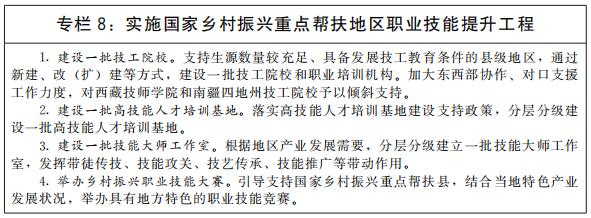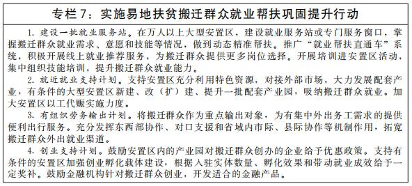 (六)提高区域就业承载力。 推动区域就业协调发展。支持东部地区发挥创新要素集聚优势,率先实现产业升级,开拓高质量就业新领域,培育高质量就业增长极。加快完善中西部和东北地区基础设施,提升产业集聚区公共服务效能,引导产业向中西部和东北地区有序梯度转移,推动就业机会向中西部和东北地区扩散。支持中西部和东北地区根据国家战略导向和发展重点,对接先进生产要素和创新资源,发展特色优势产业,改造提升传统产业,积极布局新兴产业,厚植就业创业沃土。 实施特殊类型地区就业促进行动。健全巩固拓展脱贫攻坚成果长效机制,统筹各类政策资源,强化后续扶持,以脱贫地区为重点,支持欠发达地区因地制宜发展吸纳就业效果好的富民产业。支持革命老区、边境地区等发展本地特色产业,推进资源型地区加快培育发展接续替代产业,完善就地就近就业配套设施,做好边民、少数民族劳动者和失地农民、下岗矿工、停产企业员工等困难群体就业帮扶。对高失业率地区开展专项就业援助,针对性开发和推荐就业岗位,促进失业人员再就业。 壮大县乡村促就业内生动力。深入推进新型城镇化和乡村振兴战略有效衔接,推动县乡村联动发展,促进产镇融合、产村一体,打造“一县一业”、“一乡一特”、“一村一品”经济圈,做好产业和就业帮扶。推进以县城为重要载体的城镇化建设,补短板强弱项,增强综合服务能力,促进绿色低碳发展,吸引各类生产要素向县城流动聚集,做大做强县域经济,扩大县城就业需求。支持乡镇提升服务功能,增加生产生活要素供给,为发展产业、带动就业创造良好条件,把乡镇建设成拉动农村劳动力就业的区域中心。完善农村一二三产业融合发展体系,丰富乡村经济业态,促进乡村产业多模式融合、多类型示范,打造乡村产业链供应链,加快乡村产业振兴步伐,培育乡村就业增长极。