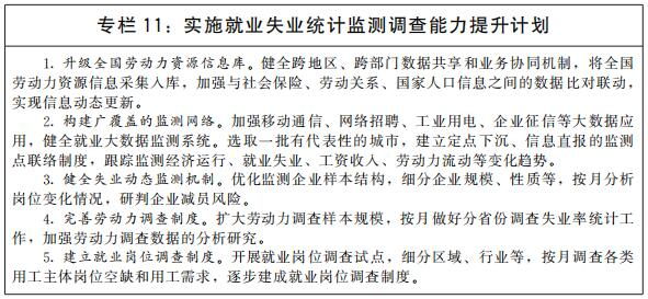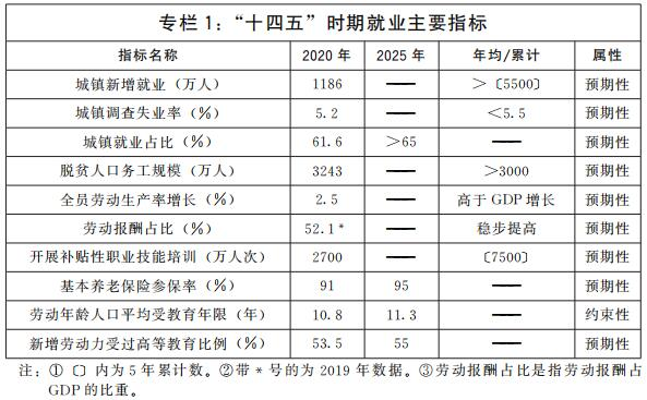 国发〔2021〕14号 各省、自治区、直辖市人民政府,国务院各部委、各直属机构: 现将《“十四五”就业促进规划》印发给你们,请认真贯彻执行。 国务院 2021年8月23日 (此件公开发布) “十四五”就业促进规划 就业是最大的民生,也是经济发展最基本的支撑。“十四五”时期,实现更加充分更高质量就业,是推动高质量发展、全面建设社会主义现代化国家的内在要求,是践行以人民为中心发展思想、扎实推进共同富裕的重要基础。本规划依据《中华人民共和国国民经济和社会发展第十四个五年规划和2035年远景目标纲要》编制,提出了“十四五”时期促进就业的指导思想、基本原则、主要目标、重点任务和保障措施,是推动就业高质量发展的工作指引。 一、发展环境 “十三五”期间,面对错综复杂的国际形势、艰巨繁重的国内改革发展稳定任务特别是新冠肺炎疫情的严重冲击,党中央、国务院始终坚持以人民为中心,将就业摆在经济社会发展优先位置,创新实施就业优先政策,推动就业工作取得积极进展。全国城镇新增就业6564万人,城镇调查失业率均值控制在5.2%,劳动年龄人口平均受教育年限从10.2年提高到10.8年,技能劳动者总量由1.3亿人增至2亿人,就业形势总体稳定,就业结构持续优化,就业质量不断提升。 “十四五”时期是我国全面建成小康社会、实现第一个百年奋斗目标之后,乘势而上开启全面建设社会主义现代化国家新征程、向第二个百年奋斗目标进军的第一个五年。当前和今后一段时期,我国发展仍然处于重要战略机遇期,党中央、国务院高度重视就业问题,实施就业优先战略,为实现更加充分更高质量就业提供了根本保证;我国已转向高质量发展阶段,以国内大循环为主体、国内国际双循环相互促进的新发展格局加快构建,经济稳中向好、长期向好,为就业长期稳定创造了良好条件;新一轮科技革命和产业变革深入发展,新兴就业创业机会日益增多;新型城镇化、乡村振兴孕育巨大发展潜力,新的就业增长点不断涌现;劳动力市场协同性增强,劳动力整体受教育程度上升,社会性流动更加顺畅,为促进就业夯实了人力资源支撑。 但也要看到,“十四五”时期就业领域也出现了许多新变化新趋势。人口结构与经济结构深度调整,劳动力供求两侧均出现较大变化,产业转型升级、技术进步对劳动者技能素质提出了更高要求,人才培养培训不适应市场需求的现象进一步加剧,“就业难”与“招工难”并存,结构性就业矛盾更加突出,将成为就业领域主要矛盾。城镇就业压力依然较大,促进高校毕业生等重点群体就业任务艰巨,在工业化、城镇化进程中,还有大量农村富余劳动力需要转移就业,规模性失业风险不容忽视。同时,就业歧视仍然存在,灵活就业人员和新就业形态劳动者权益保障亟待加强;人工智能等智能化技术加速应用,就业替代效应持续显现;国际环境日趋复杂,不稳定性不确定性明显增加,对就业的潜在冲击需警惕防范。总之,就业形势仍较严峻。必须深刻认识就业领域主要矛盾的变化,深入分析面临的挑战和风险,坚持问题导向,采取务实举措,抓住机遇,调动各种积极因素,不断开创就业工作新局面,努力实现更加充分更高质量就业。 二、总体要求 (一)指导思想。 以习近平新时代中国特色社会主义思想为指导,深入贯彻党的十九大和十九届二中、三中、四中、五中全会精神,统筹推进“五位一体”总体布局,协调推进“四个全面”战略布局,坚持稳中求进工作总基调,立足新发展阶段,完整、准确、全面贯彻新发展理念,构建新发展格局,统筹发展和安全,以实现更加充分更高质量就业为主要目标,深入实施就业优先战略,健全有利于更加充分更高质量就业的促进机制,完善政策体系、强化培训服务、注重权益保障,千方百计扩大就业容量,努力提升就业质量,着力缓解结构性就业矛盾,切实防范和有效化解规模性失业风险,不断增进民生福祉,推动全体人民共同富裕迈出坚实步伐。 (二)基本原则。 ——坚持就业导向、政策协同。继续把就业摆在经济社会发展和宏观政策优先位置,作为保障和改善民生头等大事,把稳定和扩大就业作为宏观调控的优先目标和经济运行合理区间的下限,根据就业形势变化,及时调整宏观政策取向、聚力支持就业。 ——坚持扩容提质、优化结构。兼顾容量、质量与结构,抓住主要矛盾,在多措并举创造更多高质量就业岗位的同时,更加重视日益凸显的结构性就业矛盾,聚焦劳动者技能素质提升,突出抓好技术技能人才培养培训,推动形成劳动力市场更高水平的供需动态平衡。 ——坚持市场主导、政府调控。推动有效市场和有为政府更好结合,既要坚持市场化社会化就业方向,加快破除制约就业的体制机制障碍,充分发挥市场配置劳动力资源的决定性作用,又要强化政府责任,优化整合各类资源,为促进就业提供强有力政策支持和基础性服务保障。 ——坚持聚焦重点、守住底线。紧盯就业领域关键环节和突出问题,瞄准重点地区、重点行业和重点群体,制定更加精准有效的举措,因地因企因人强化分类帮扶援助,切实兜牢民生底线。 (三)主要目标。 到2025年,要实现以下目标: ——就业形势总体平稳。城镇新增就业5500万人以上,努力实现更大规模,城镇调查失业率控制在5.5%以内,重点群体就业保持稳定。城乡、区域就业机会差距逐步缩小,劳动力