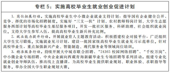 五、完善重点群体就业支持体系,增强就业保障能力 聚焦高校毕业生等重点群体,坚持市场化社会化就业与政府帮扶相结合,促进多渠道就业创业。 (十)持续做好高校毕业生就业工作。 拓宽高校毕业生市场化社会化就业渠道。结合国家重大战略布局、现代产业体系建设、中小企业创新发展,创造更多有利于发挥高校毕业生专长和智力优势的知识技术型就业岗位。健全激励保障机制,畅通成长发展通道,引导高校毕业生到中西部、东北、艰苦边远地区和城乡基层就业。围绕乡村振兴战略,服务乡村建设行动和基层治理,扩大基层教育、医疗卫生、社区服务、农业技术等领域就业空间。为有意愿、有能力的高校毕业生创新创业提供资金、场地和技术等多层次支持。 强化高校毕业生就业服务。健全校内校外资源协同共享的高校毕业生就业服务体系,完善多元化服务机制,将留学回国毕业生及时纳入公共就业人才服务范围。加强职业生涯教育和就业创业指导,加大就业实习见习实践组织力度,开展大规模、高质量高校毕业生职业技能培训,提高高校毕业生就业能力。实施常态化高校毕业生就业信息服务,精准组织线上线下就业服务活动,举办行业性、区域性、专业性专场招聘,加强户籍地、求职地、学籍地政策服务协同,提高供需匹配效率。对离校未就业高校毕业生开展实名制帮扶,健全困难高校毕业生就业援助机制。强化择业就业观念引导,推动高校毕业生积极理性就业。开展“最美基层高校毕业生”学习宣传活动。