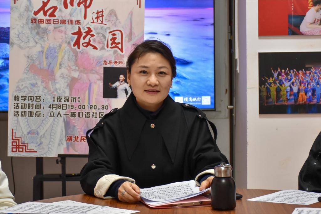 4月8日,永利官网戏曲团在心语社区举办“名师进校园”指导活动。中国戏剧家协会会员、国家二级演员、湖北省戏剧家协会会员龚敏受邀出席并担任指导教师。龚敏带领学生复习《黄鹤楼》选段,为学生讲解新学曲段《夜深沉》背后蕴含的民族传说,剖析戏剧唱段情感,从咬字清晰、换气自如、节奏控制、情绪抒发等方面指导学生学习选段。龚敏还向学生分享地方戏南剧表演经验与传播地方戏南剧经历,借此让学生了解南剧的发展历史,推广非遗文...