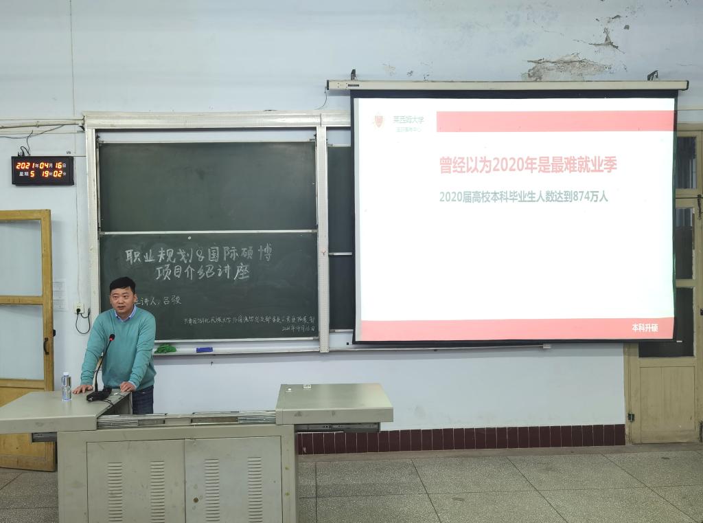 时间:2021-04-19 编辑:学生科 点击:本网讯(通讯员 李梦然/摄影 蓝雨璇 赵雪)4月16日晚,我院于文汇楼6401教室成功举办以“职场风云 预测行远”为主题的职业规划&国际硕博项目介绍讲座,就业规划讲师吕俊担任此次讲座主讲人。