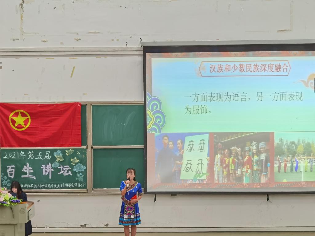 经过初赛的激烈角逐,共有十名选手进入决赛。本次百生讲坛活动分为主题演讲和学习一点通两个环节。一号选手邹胜主题演讲题为“民族团结共奋进,我辈齐心筑强国”她以H&M辱华事件展开,将主题扩展至国家团、民族团结层面,呼吁新时代青年维护民族团结。学习一点通环节,她和同伴的表演极具感染力,赢得观众阵阵掌声。十号选手李晶题为“星星之火,可以燎原”的主题演讲深情讲述了英雄刘胡兰的故事,她投入的演讲激起观众对英雄真挚的敬意。八号选手张祉琪演讲主题为“历史照亮未来 征程未有穷期”,从习近平总书记为抗战英雄颁发奖章到红色记忆世代相传,她讲述了我们国家的红色革命历史。她有力地说道“一个有希望的民族不能没有英雄,一个有前途的国家不能没有先锋。”最终,她以98.1分的高分一举夺得桂冠。