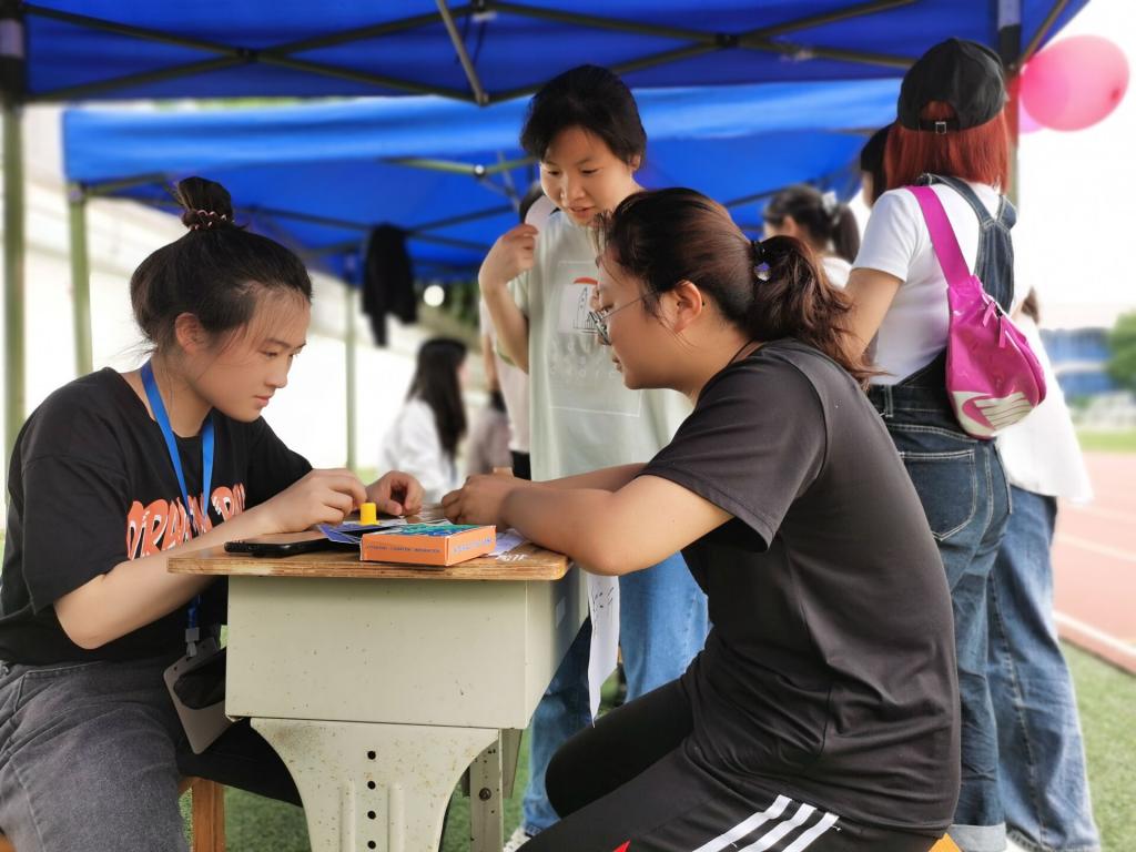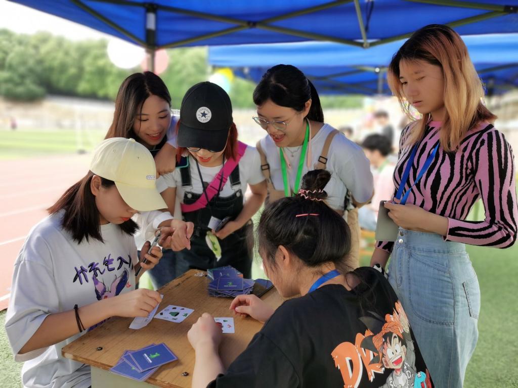 线下活动采取在民族体育场举办趣味游戏的方式来进行。趣味游戏活动由吹杯子、对对碰、心愿墙及知识竞答四个游戏组成,通过趣味游戏活动,不仅能够调动学生的积极情绪,也有利于减缓学生心理压力。令学生在游戏的过程中收获快乐、释放自我、结识伙伴、认同自我。每个游戏均带有不同含义且趣味十足,活动现场一片欢声笑语。