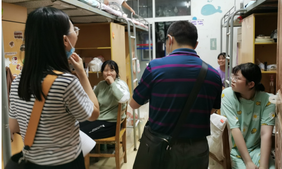 会后,各班主任进入学生寝室进行走访。班主任点名过后询问新生第一天居住感觉以及是否适应等问题,在了解到学生的困难后也及时为学生解决。