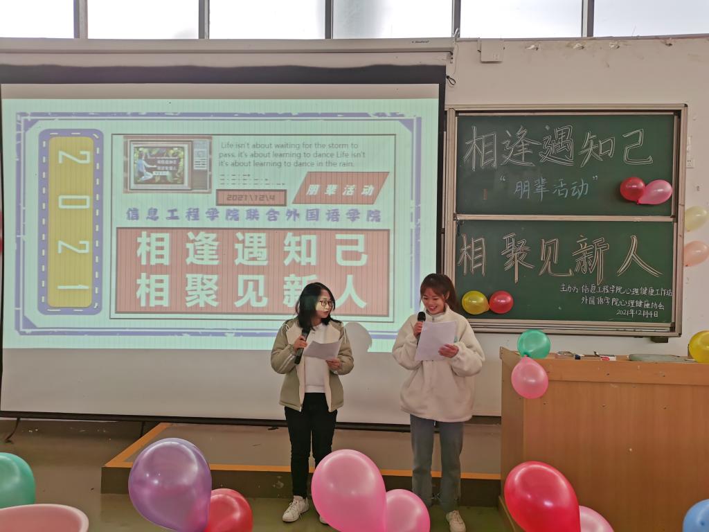 时间:2021-12-05 编辑:学生科 点击:本网讯(通讯员 余胡铃澜/摄影 王芷依)12月4日,信息工程学院心理健康协会联合外国语学院心理健康协会于永利官网修远楼5B509教室举行,2021年秋季学期朋辈活动。本次活动以“相逢遇知己,相聚见新人”为主题,旨在给同学们创造一个能够更多地了解学校、结交更多朋友的机会。两院心理健康协会全体成员参加此次活动,肖霖怡和谭舒蕾担任活动主持人。