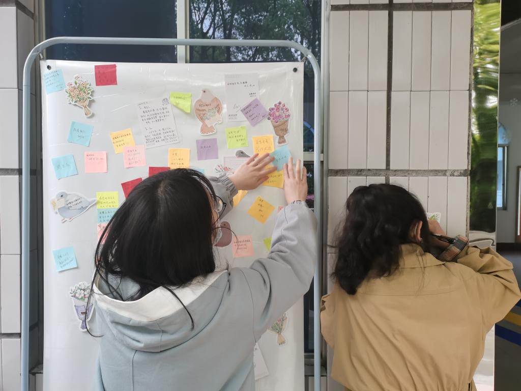 “小小便利贴传温情,大大明信片送祝福”。本次活动分为两阶段,4月15日-4月16日为第一阶段,由工作人员在西苑、东苑、北苑餐厅及外国语学院大厅摆设情绪箱及易拉宝;同学可从各处情绪箱中拿取明信片或便利贴,写上自己想说的话或祝福后贴在易拉宝上进行展示。