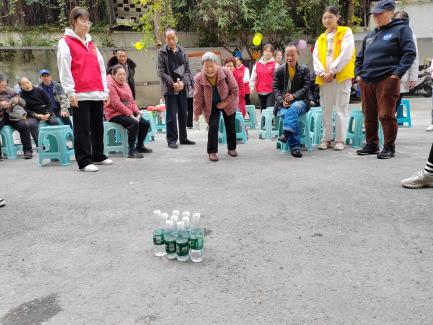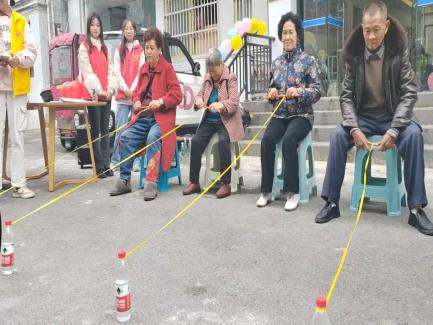 活动还设置了“乒乓五子棋”“反应力比赛”“模仿保龄球比赛”“水瓶快跑”四个项目,参与活动的老人被分成两组,分别命名为“平安队”和“幸福队”。在考验团结协作能力的“乒乓五子棋”项目中,老人们跃跃欲试,齐心协力为自己的队伍加分;“反应力比赛”中,老年人们根据口令摸摸耳朵、拍拍肩膀、跺跺脚、抢瓶子……大家精神饱满、奋勇争先,在各个项目中都竭尽全力、大显身手,现场气氛热烈,喝彩声、加油声不断,充满了欢声笑语。