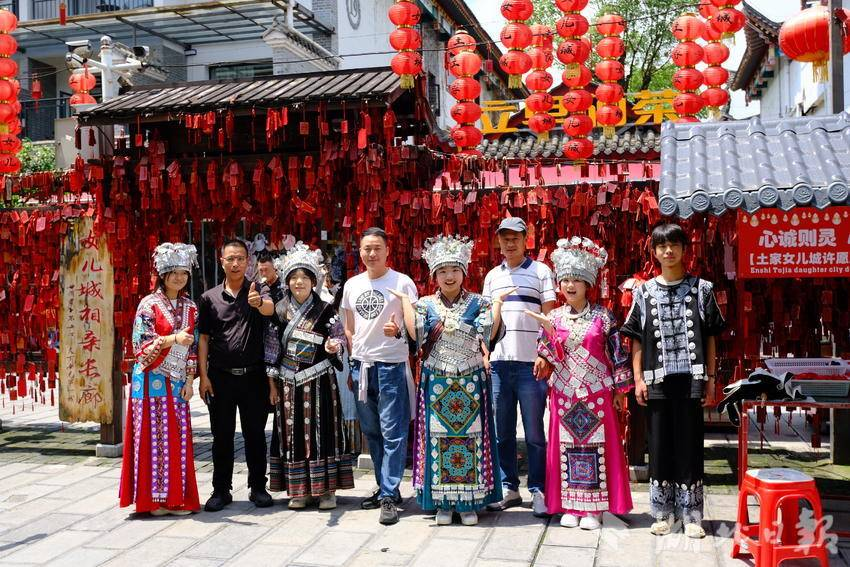 “Hello,everyone,welcome to Enshi Tusi City……”6月29日,外国语学院“译”路“童”行志愿宣讲团走进恩施土家女儿城和土司城,身着土苗民族服饰,以“大手牵小手”的模式,带领小学生穿梭于恩施女儿城的繁华市井与土司城的古朴庄严之间。他们用“双语”讲解恩施少数民族特色文化与习俗,并录制成片。土司城的历史渊源是什么?这些雕像分别代表着什么?你知道土家族的女儿会习俗吗?……一帧一画,一汉一英,“译”路“童”行志愿宣讲团融合“双语”新路径和地域文化的独特韵味,为恩施开启文旅宣传的“英语+旅游”新模式,擦亮恩施文化的“名片”,推动独具魅力的恩施文化走出恩施、走向世界。