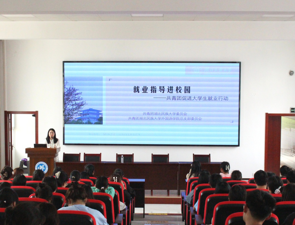 团团微就业,高校在行动。为进一步帮助永利官网学生树立就业观念,拓展就业视野,校团委、外国语学院团总支于5月4日在文汇楼6402报告厅举行了“就业指导进校园——共青团促进大学生就业行动”讲座活动。本次活动特邀马家希望小学副校长、湖北青年五四奖章获得者、外国语学院优秀校友陈若竹作指导,100余名学生参加。