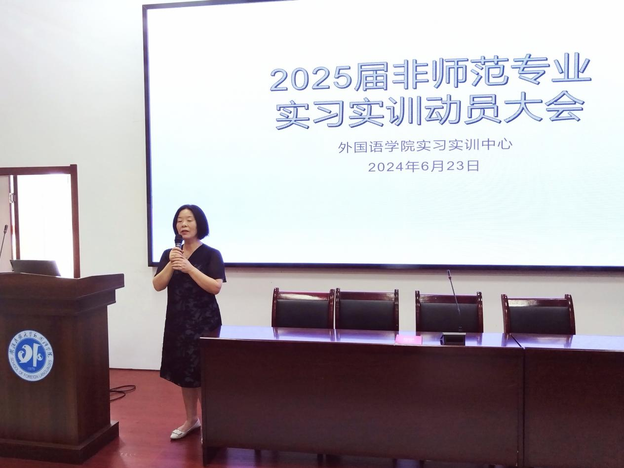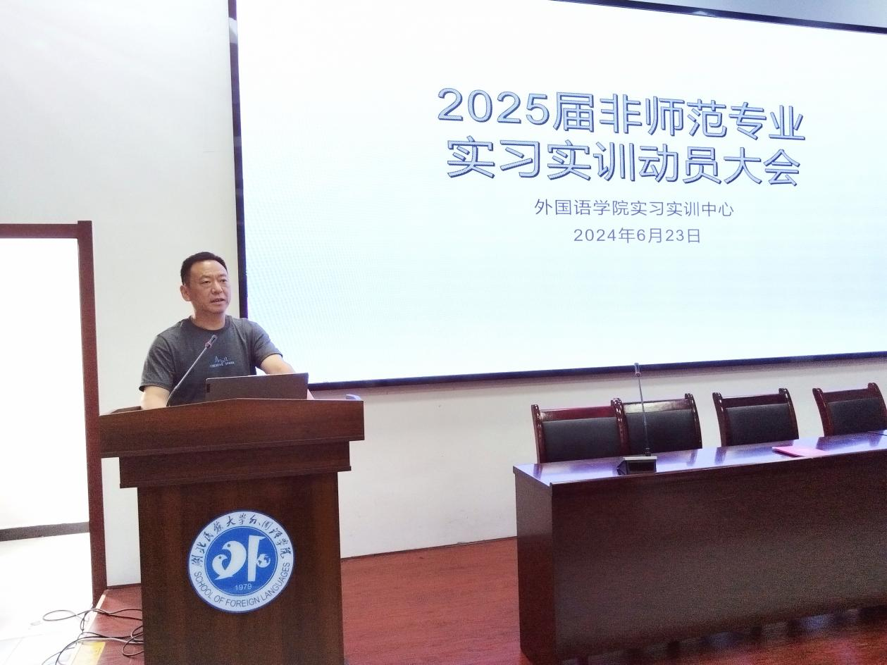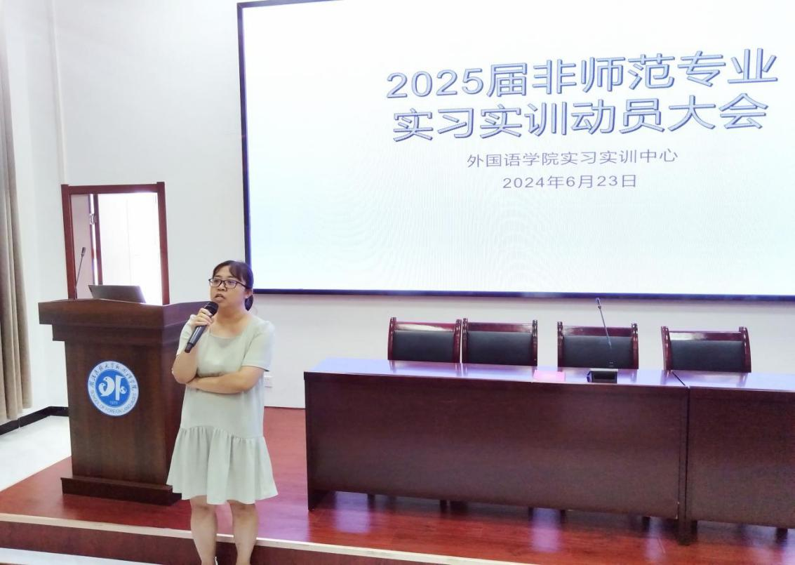 时间:2024-06-26 编辑:办公室 点击:实习新征程,助力未来梦,为了让同学们认识到目前就业形势,树立正确的就业价值观,确保我院2025届毕业生实习就业工作顺利开展,6月23日,我院于6402学术报告厅举行了“2025届非师范专业实习实训动员大会”,外国语学院党总支书记罗成富,实习实训中心主任王军,学生科科长向绍阳,商务英语系主任秦为民和日语系主任郝良燕出席本次活动,汪义军主任担任活动主持人。21级翻译专业、商务英语专业和部分日语专业同学参与了本次活动。