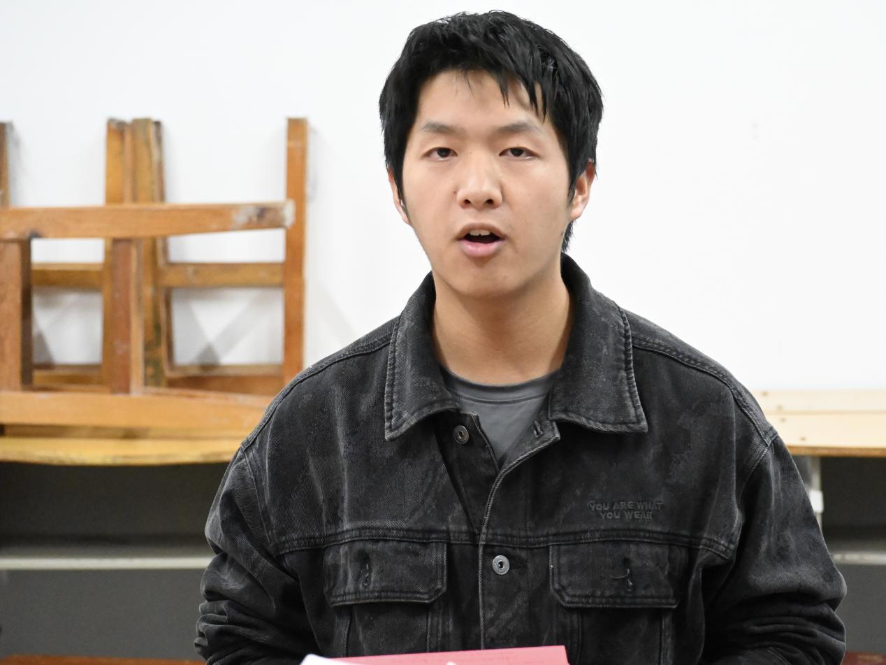 “在这本书中,我们仿佛穿越时空,回到那个动荡而充满激情的年代”。2022级4班的退伍学生苏继澳向大家分享了他在部队读过的《苦难辉煌》——书中描绘了20世纪二三十年代的中国历史进程。苏继澳先向大家介绍了本书作者和写作背景,随后分享了方志敏的作品以及杨靖宇的事迹,将大家的思绪带回那个特殊的年代。最后,他鼓励大家向先辈学习,从书中汲取力量,努力奋斗。