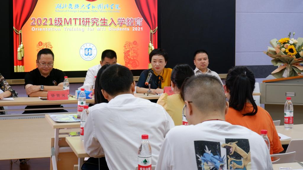 9月11日,外国语学院2021级MTI研究生入学教育活动在文汇楼多功能录播室举行。学院院长骆贤凤、党总支书记周代明、副院长陈斌、副院长张婷,学科建设科科长陈海兵以及MTI教育中心刘孔喜、谭雪莲、刘波等领导老师参加。副院长陈斌主持活动。