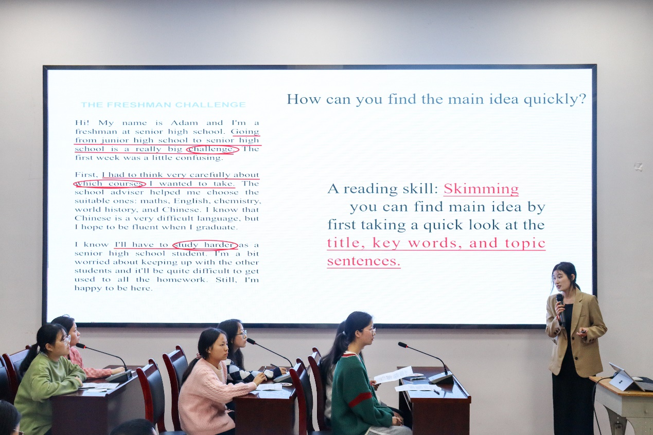 外国语学院院长骆贤凤教授、教评专家曾奇副教授、第一教工支部书记鄢春艳副教授、英语系主任覃军博士、副主任易红博士、商务英语系副主任李靖博士等受邀出席大赛并担任大赛评委。大赛伊始,外国语学院院长骆贤凤教授为大赛致辞。骆院长强调,师范生教学技能大赛是推动我院师范教育改革创新、强化师范类专业实践教学的有效途径,他希望参赛选手能够从比赛中提升教学技能,提高师范生综合素质。