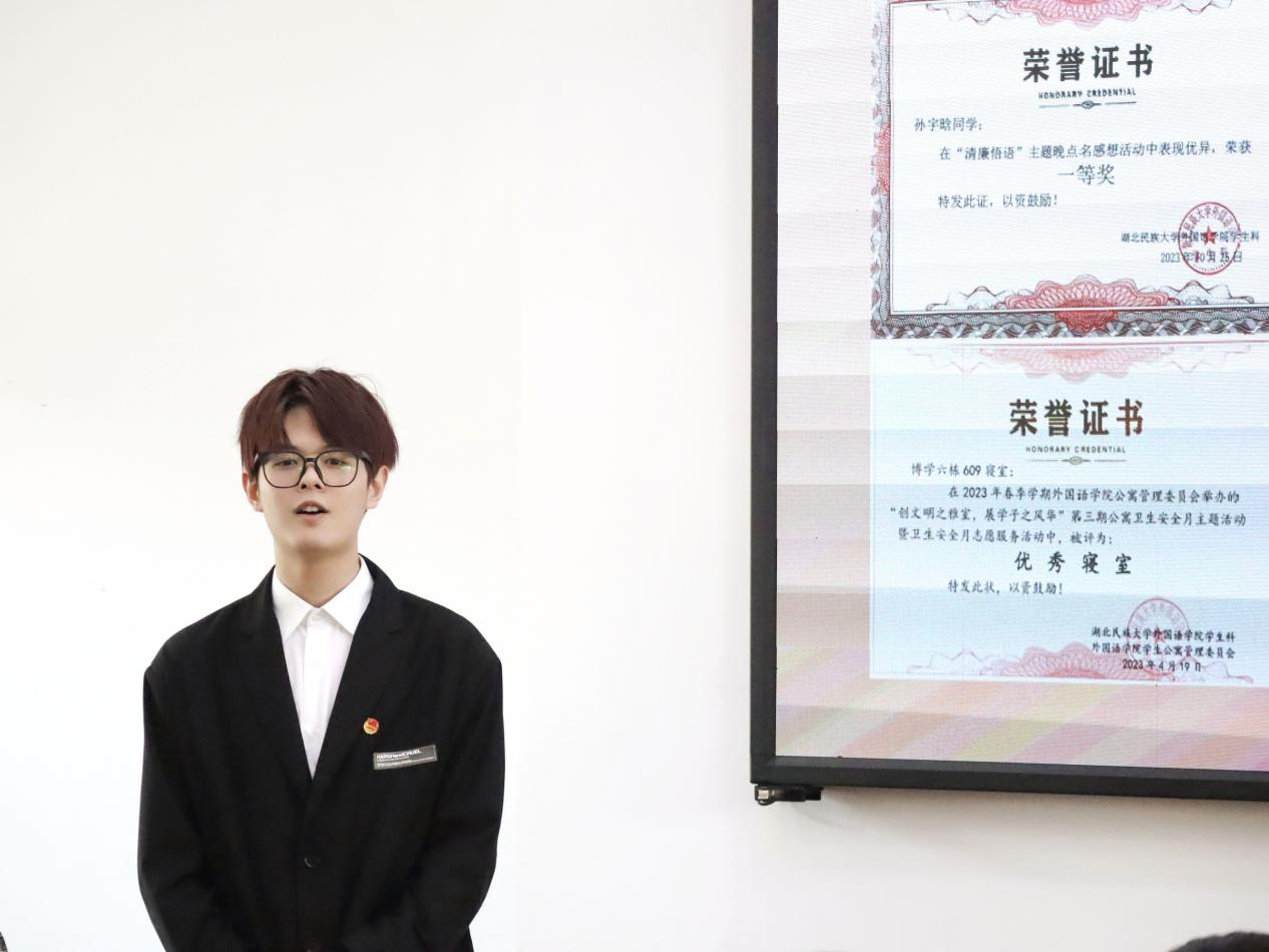简介:孙宇晗,男,湖北安陆人,3044am永利集团3044noc外国语学院2021级英语专业学生,中共预备党员。2021-2022年度“优秀共青团干部”、2022-2023年度“四星级志愿者”、外国语学院“最美志愿者”、2023-2024年度“十佳共青团员”。
