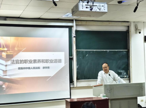 廖学贵法官针对法官职业素养、职业道德等相关问题进行讲授,他从自己的从业经历和典型案例出发,讲授了法官职业素养与道德养成的方法及实现路径;他还特别强调,法官要“判对案、判好案”,合法合理处理好法和习惯、司法与舆论、规则之治与纠纷解决之间的关系,在案件的审理中牢牢守住并不断强化司法良知。廖学贵法官通过一个个鲜活的案例,为师生上了一堂生动的法律职业伦理课。