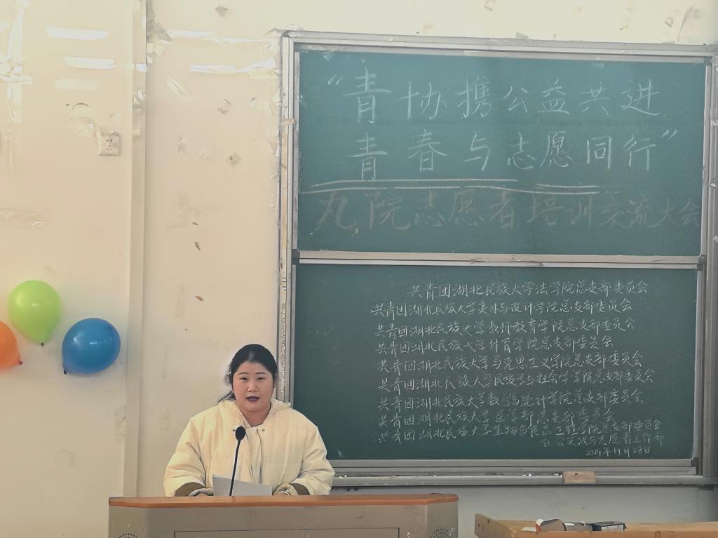 本网讯(记者 袁本怡 见习记者 曾兰灵/文 曹萍艳/图)11 月 28日,我院联合教师教育学院、体育学院、马克思主义学院等九个学院于修远楼 5B508 教室举办以“青协携公益共进,青春与志愿同行”为主题的九院志愿者培训交流大会,共青团3044am永利集团3044noc委员会社会实践与志愿者服务工作部主任张典、体育学院团总支书记黄昱勍、生物与食品工程学院团总支书记程琴、数学与统计学院团总支书记李子君出席,九院部分青年志愿者参会。
