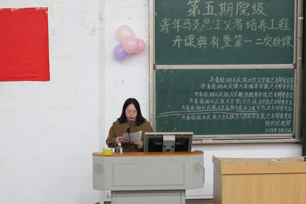 本网讯(记者 袁本怡 见习记者 刘微微/文 谭正法 侯方俊/图)11月23日,我院联合体育学院、生物与食品工程学院、民族学与社会学学院、数学与统计学院、教师教育学院等六个学院于修远楼5B508教室共同举办第五期院级“青年马克思主义者培养工程”开课典礼暨第一次授课。我院团总支书记谢学婧、体育学院团总支书记黄昱勍、生物与食品工程学院团总支书记程琴、民族学与社会学学院团总支书记吴尚、数学与统计学院团总支书记李子君、教师教育学院教师刘纮均出席本次活动。